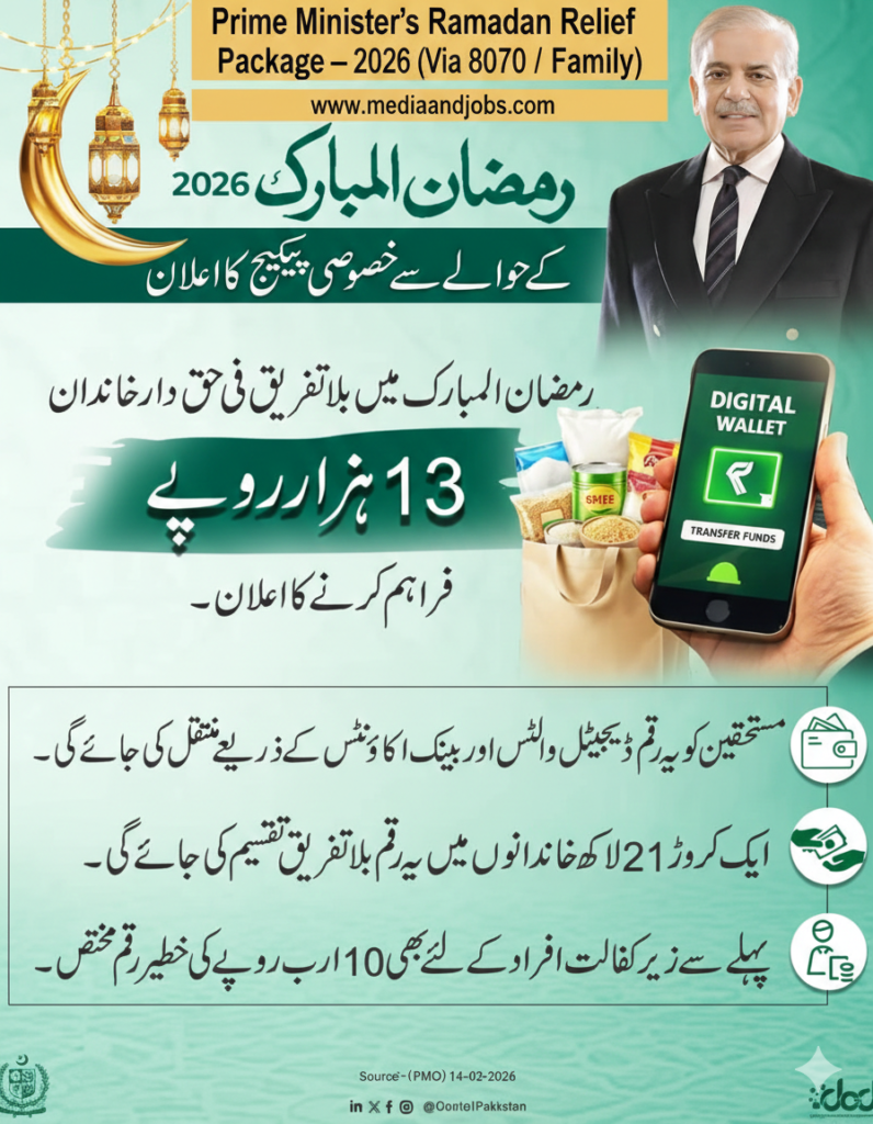 وزیراعظم رمضان ریلیف پیکیج 2026 – فی خاندان 13,000 روپے (8070 / 9999 / 8171 کے ذریعے)