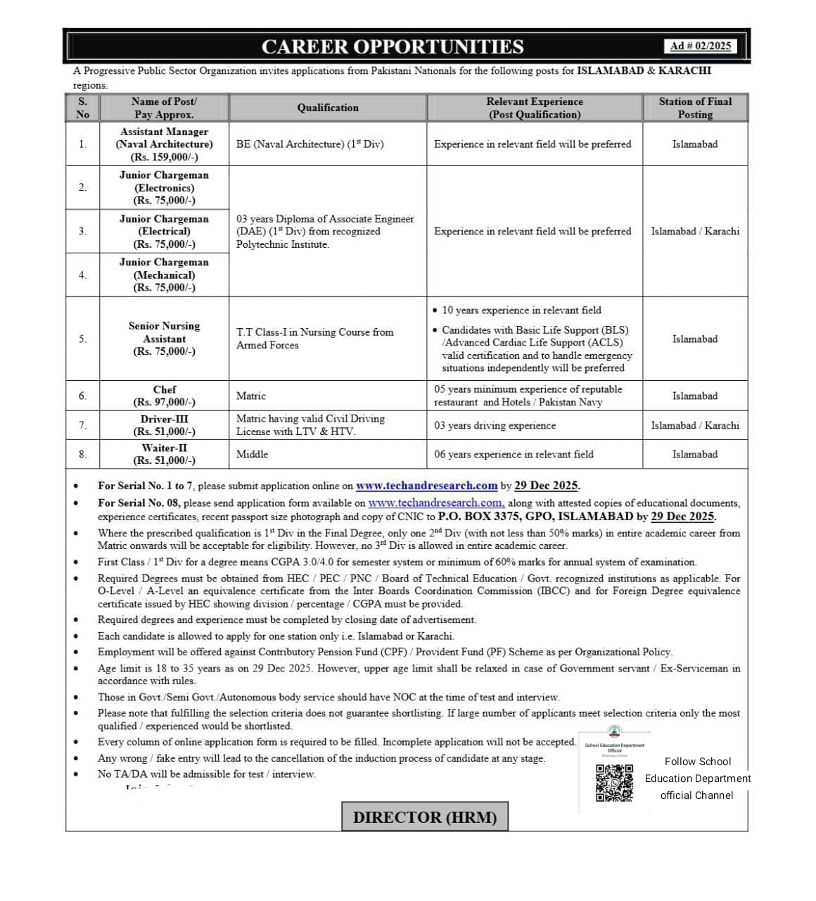 Progressive Public Sector Organization Jobs 2025 Islamabad Karachi: Apply Online for Assistant Manager & Chargeman Posts – Deadline Dec 29 Introduction/Overview A leading Progressive Public Sector Organization in Pakistan has announced exciting career opportunities in Advertisement No. 02/2025, inviting applications from qualified Pakistani nationals for technical and support roles in Islamabad and Karachi. These positions … Read more